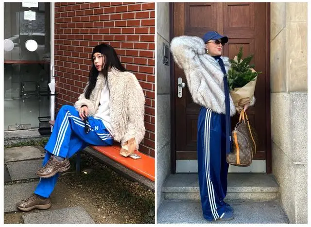 “校服版”运动裤的裤型会更加向下垂顺,而且不拖沓也不显膨胀感,与毛绒外套的混搭,充满运动感之余又多了些风格。