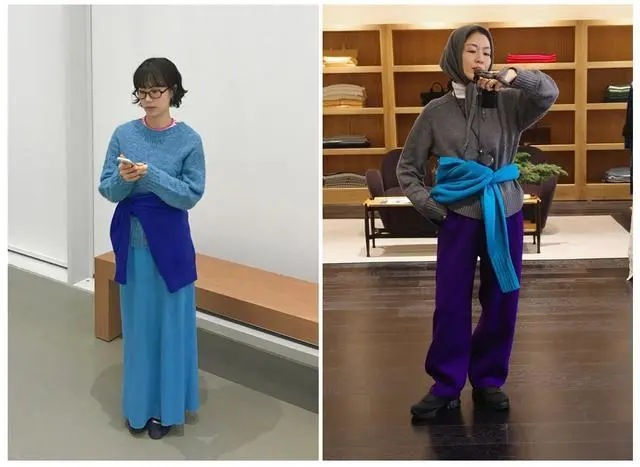 对于一些基础款的针织毛衣,则可以通过叠穿的方式打破沉闷,高领毛衣叠穿针织衫,或者将针织衫系在腰间,同色系的搭配也会很显气质。