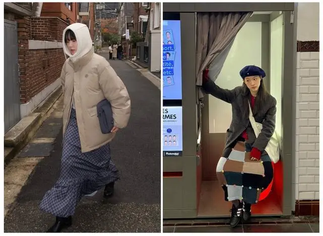 格纹和拼接半裙也很有秩序感的情绪格调,清冷中又透着一丝浓郁的风格,即使上身裹着厚厚的羽绒服,带有格纹的半裙都能营造出从容的松弛感。
