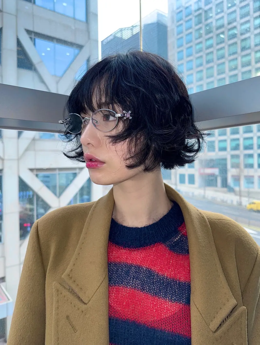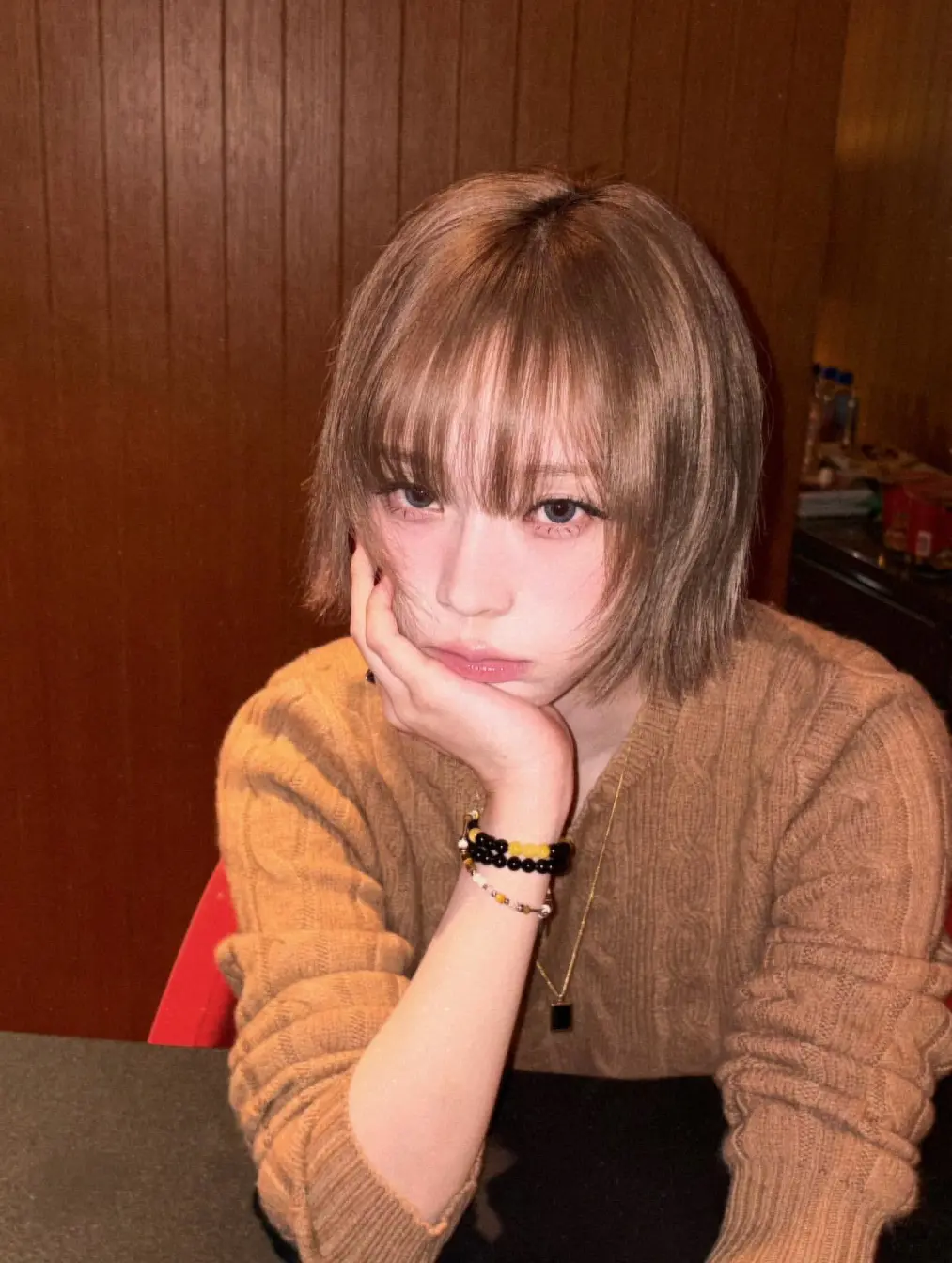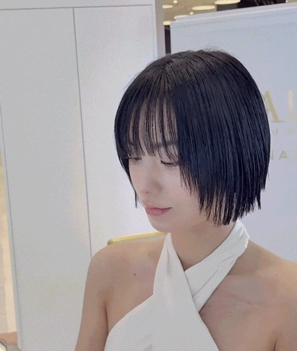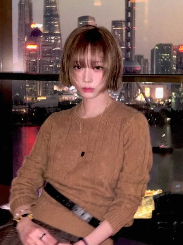 比较年轻化的效果还可以参考aespa的Winter,她自从剪了这款波波头之后又一次美出圈。韩味很浓的线条刘海作为第一个大层次,第一时间带来俏皮的印象,与整体的钝感一刀切相呼应,两颊的第二个小层次起到衔接作用,让脸型和发型整体融合,瓜子脸、鹅蛋脸都是这款发型的适配脸型。