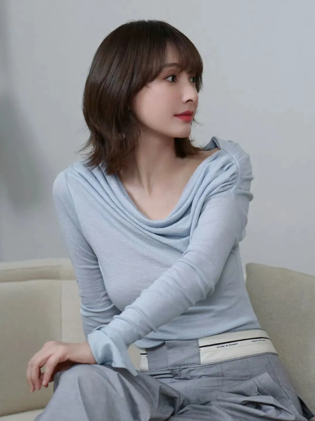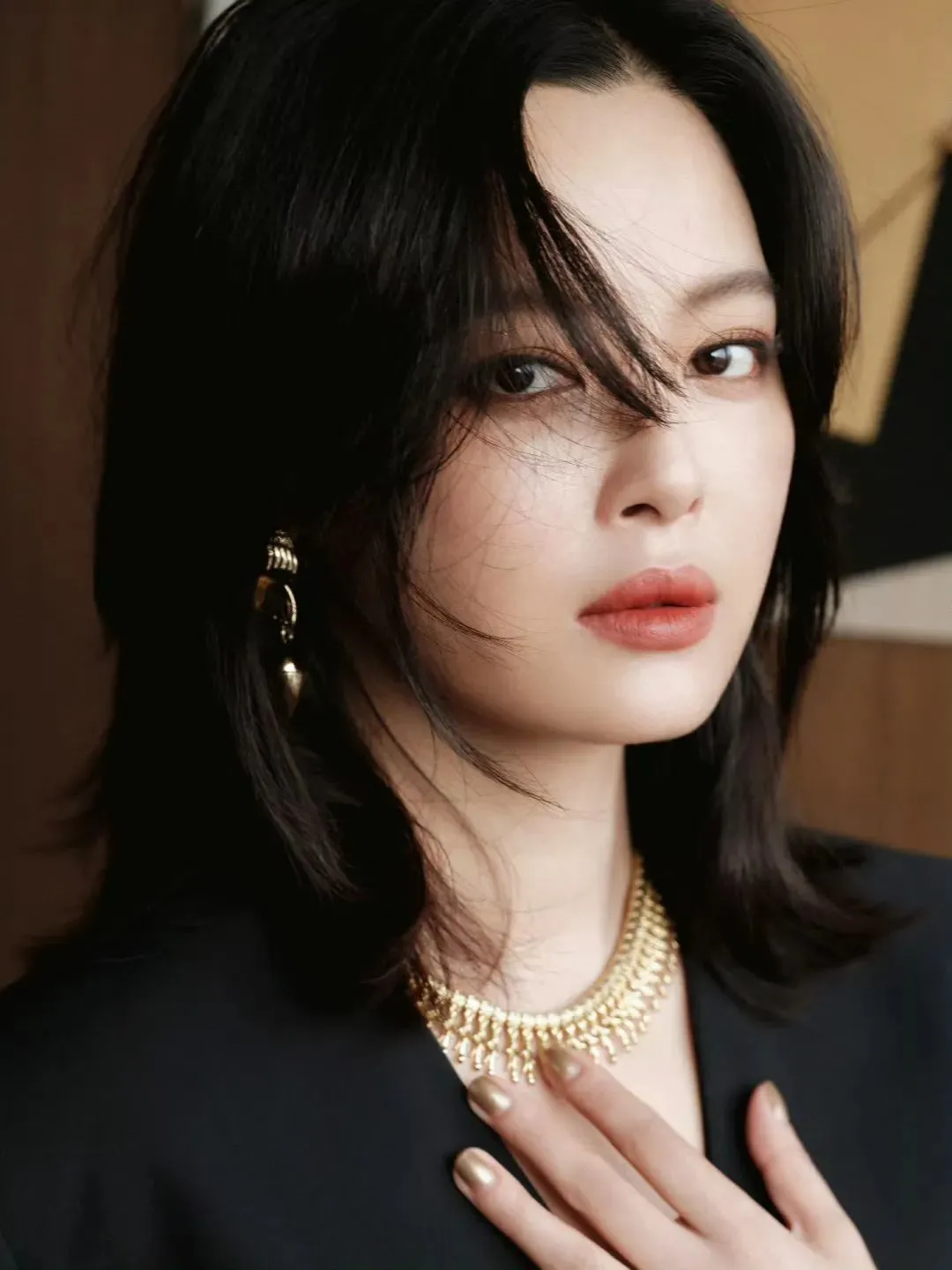 秦岚就属于下巴比较尖的瓜子脸,她初次尝试短发是先从一刀切开始,留长一点之后还改成了这款分为两个大层次的短发,发尾的钝角处理柔和了瓜子脸的线条,让她更加温柔妩媚。