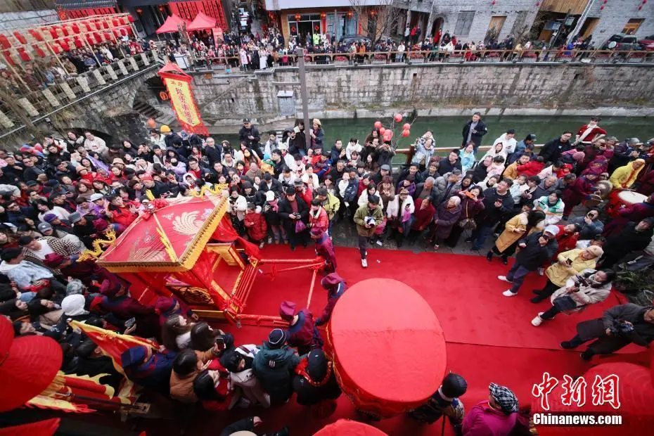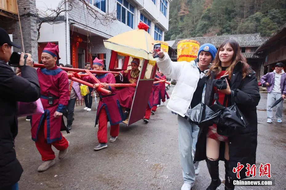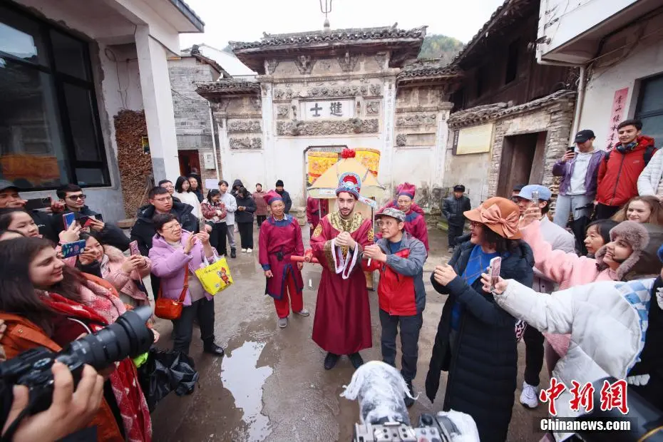 1月31日大年初三,中外游客观看传统中式婚礼。春节期间,浙江磐安双峰乡举行“念想双峰·羊家有喜”羊味年系列活动,吸引中外游客参与。双峰乡大皿村是“中国传统村落”,村里羊姓为大姓,被称为“中华羊氏第一村”。郭丽泉 摄