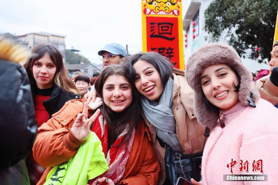 1月31日大年初三,国际友人在浙江磐安感受年味。春节期间,浙江磐安双峰乡举行“念想双峰·羊家有喜”羊味年系列活动,吸引中外游客参与。双峰乡大皿村是“中国传统村落”,村里羊姓为大姓,被称为“中华羊氏第一村”。郭丽泉 摄
