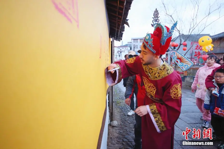 1月31日大年初三,国际友人装扮成“状元郎”,写下祝福。春节期间,浙江磐安双峰乡举行“念想双峰·羊家有喜”羊味年系列活动,吸引中外游客参与。双峰乡大皿村是“中国传统村落”,村里羊姓为大姓,被称为“中华羊氏第一村”。郭丽泉 摄