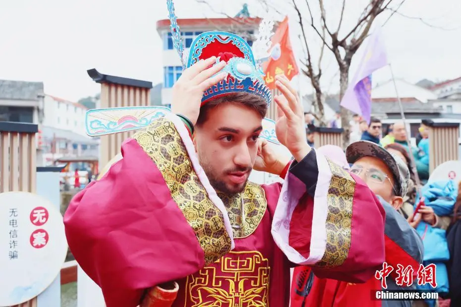 1月31日大年初三,国际友人装扮成“状元郎”,体验“荣归故里”。春节期间,浙江磐安双峰乡举行“念想双峰·羊家有喜”羊味年系列活动,吸引中外游客参与。双峰乡大皿村是“中国传统村落”,村里羊姓为大姓,被称为“中华羊氏第一村”。郭丽泉 摄