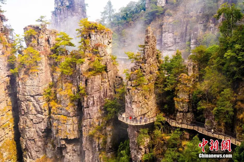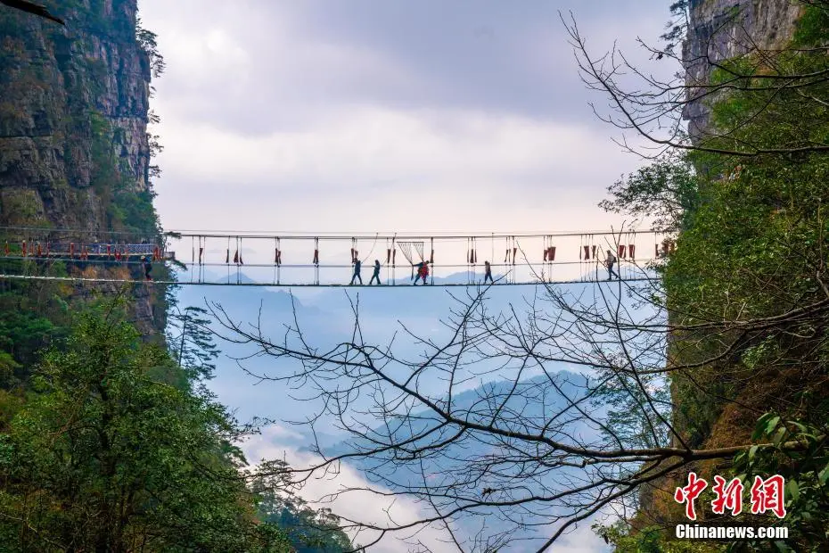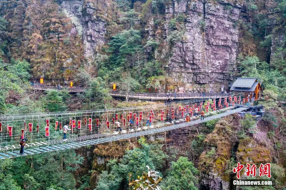 图为2月1日,游客在大瑶山盘王界景区体验峡谷五彩栈道。高如金 摄