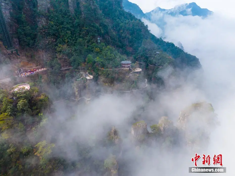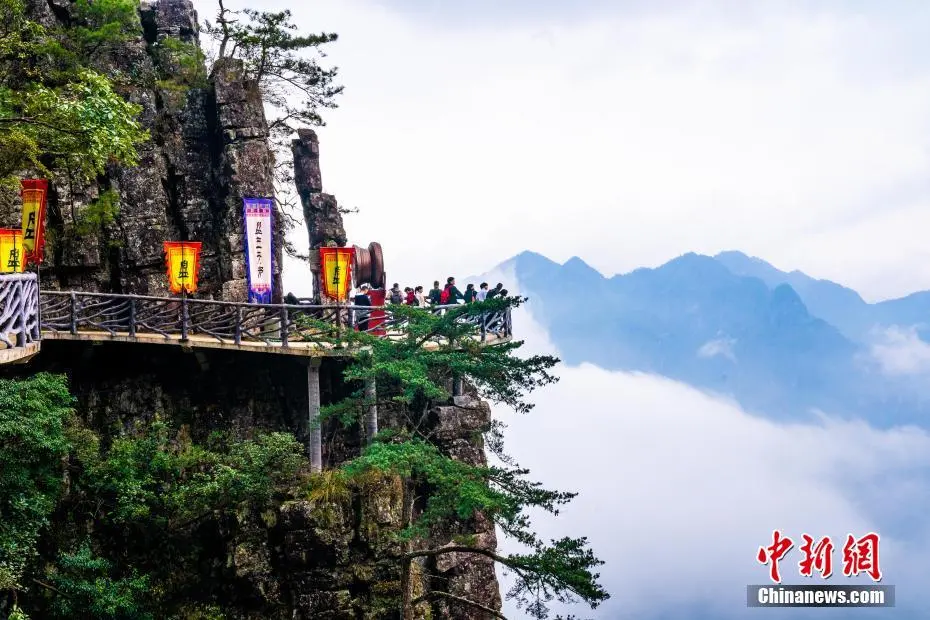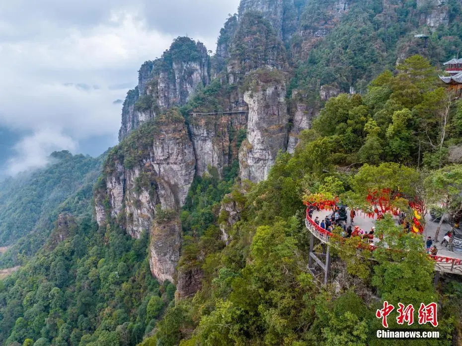 春节期间,广西来宾市金秀瑶族自治县大瑶山盘王界景区将瑶族舞香龙、蒙虢舞等非遗表演融入景区中,吸引许多游客前来观光体验。图为2月1日,游客在大瑶山盘王界景区观光游玩。高如金 摄