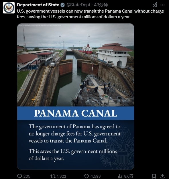 【文/观察者网 齐倩】当地时间2月5日晚,美国国务院在社交媒体X平台发布声明称:“美国政府船只现在可以免费通过巴拿马运河,这可以每年为美国政府节省数百万美元。”