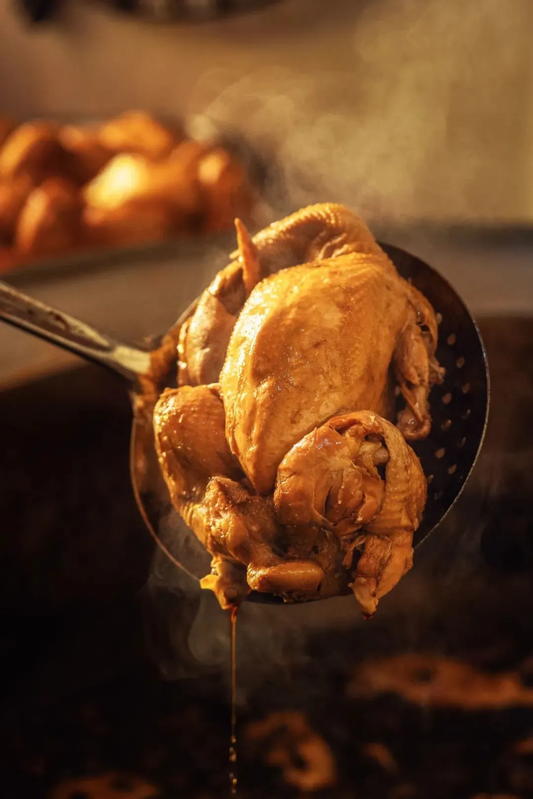 创立于清朝仁宗年间的二毛烧鸡,将雏鸡浸入砂仁、桂皮、良姜、八角、陈皮、白芷、上等酱油等十几味料材中,蒙油盖顶,熬煮数小时。煮好的烧鸡咸香清纯口齿留香,碎小的骨头一嚼就烂,光是扒开那一下,药香、酱香、肉香混合的香味便可以让你在摊位前动弹不得。