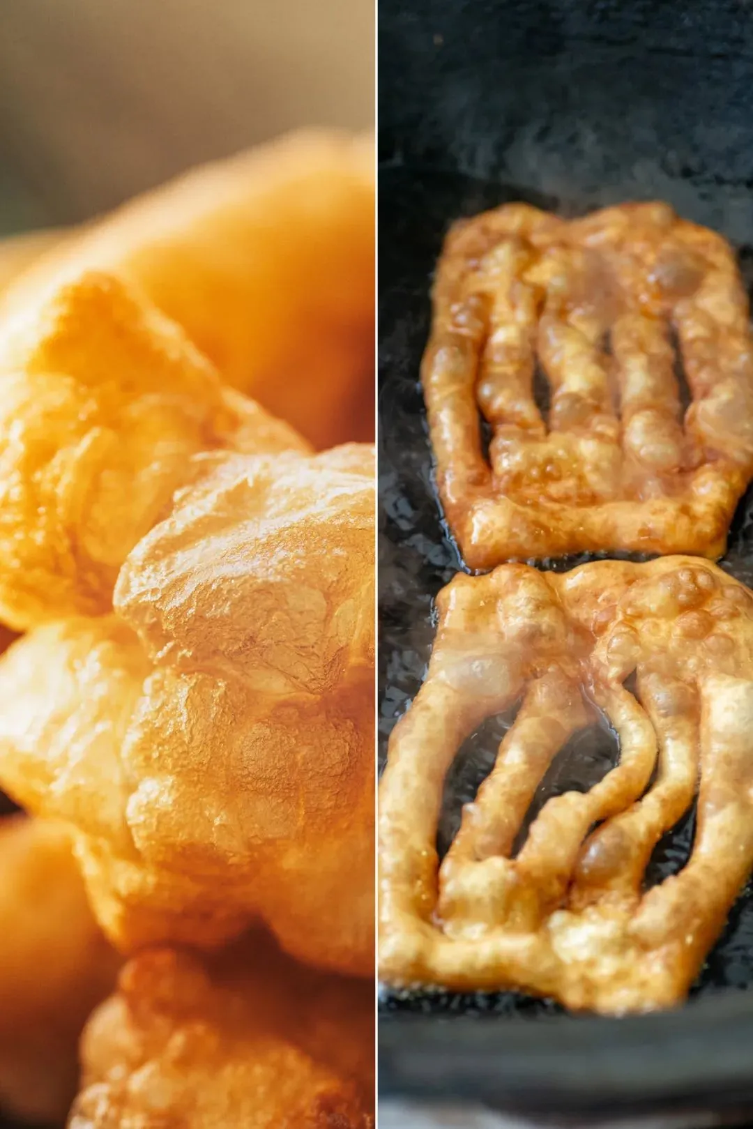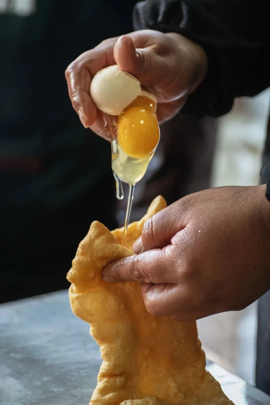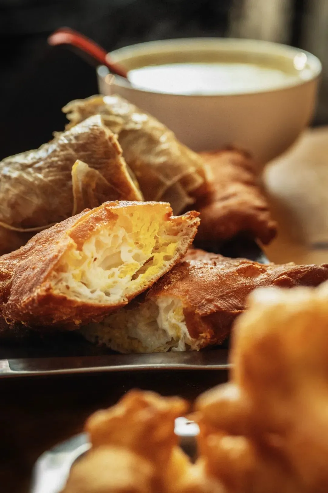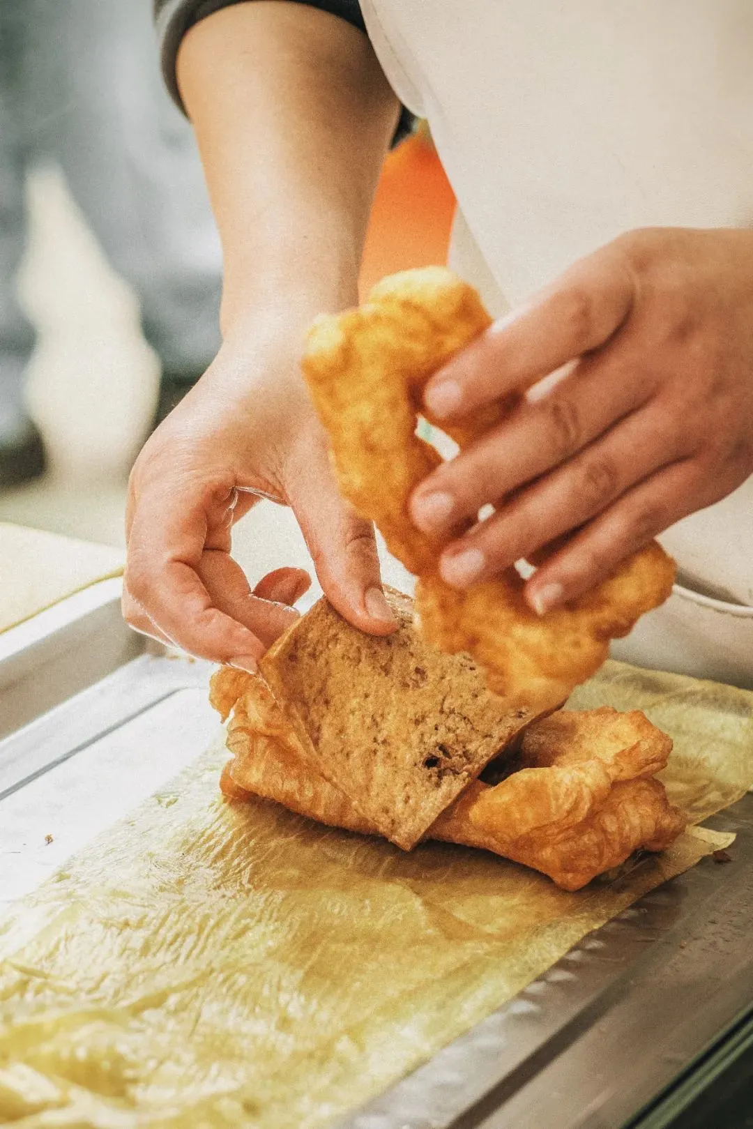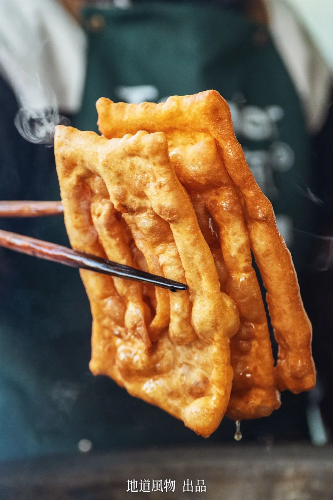 简单如一个早餐摊的馃子,也需要师傅的进行精心搭配。譬如早餐摊最好卖的气布袋:将两张四角面皮炸到中间鼓起来,再捞起来开一个小口磕进鸡蛋,继续下锅去炸。此时,围在大锅面前的食客们一腔心思都在这个“荷包”里的蛋上,有没有漏黄,有没有泄气……当这个敛声屏气的时刻过去,内里嫩香到极致的鸡蛋,便在这个布袋型馃子的酥脆中藏下了最舒适的柔嫩。
