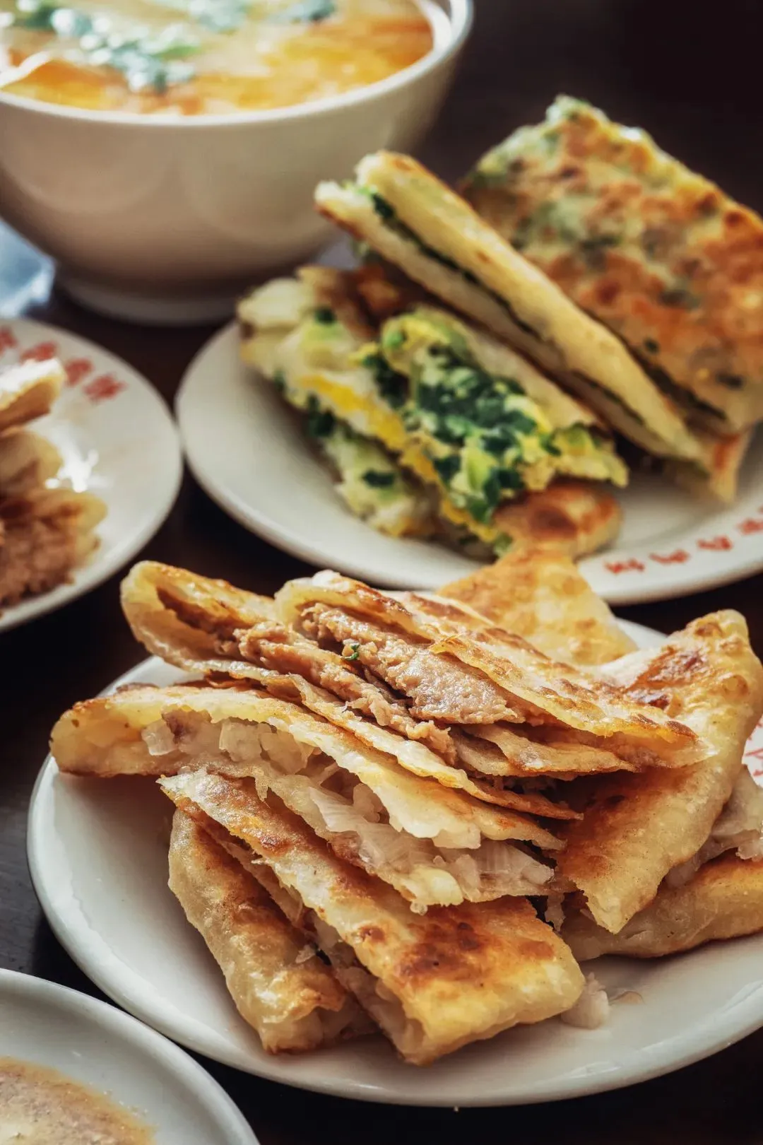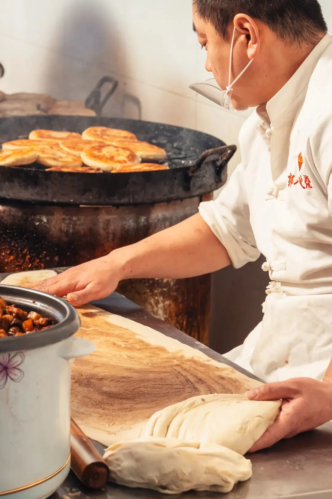 在古城西边的会存肉饼店,你会看到与各式烧饼店完全不同的画面:宽敞的饭厅藏于其中,楼上的雅间与圆桌“库库上菜”,炒菜、肉汤、烧鸡一应俱全,但这里桌上的C位,永远是饱满的肉饼:摊开翻烤的圆饼,用羊肉作馅,加入鸡蛋,边烤边抹油……烤好的肉饼皮薄、肉馅肥而不腻,一口下去,满是肉汁香醇。