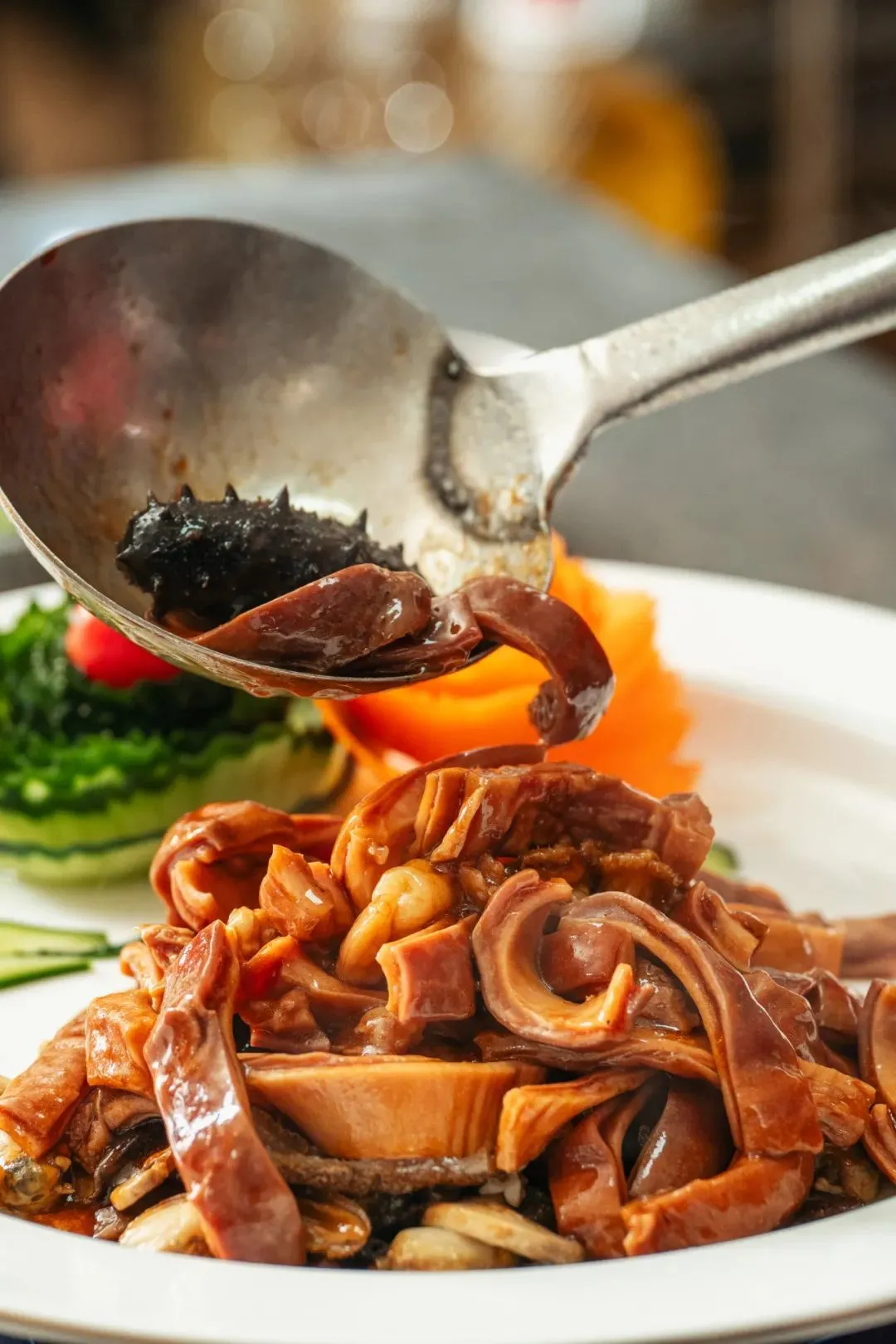 图2 京葱烧蹄筋软糯中透出扑鼻的酱香。
