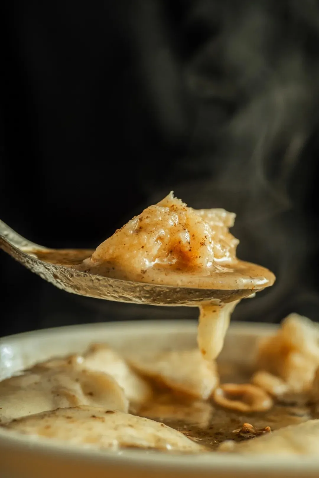 为什么大名这么爱碳水?吃一碗当地的“馓”就知道:浓郁的牛羊肉脂油香味只是其次,重要的是麦仁独有的甘甜香气特别惊人,而紧接下来的绵密嚼劲,会让你越嚼越香——当然,若浸入一块馒头,那个畅快感更是直冲脑门!