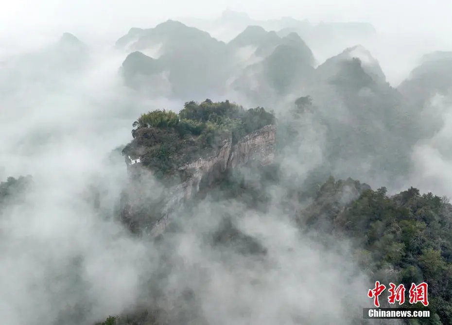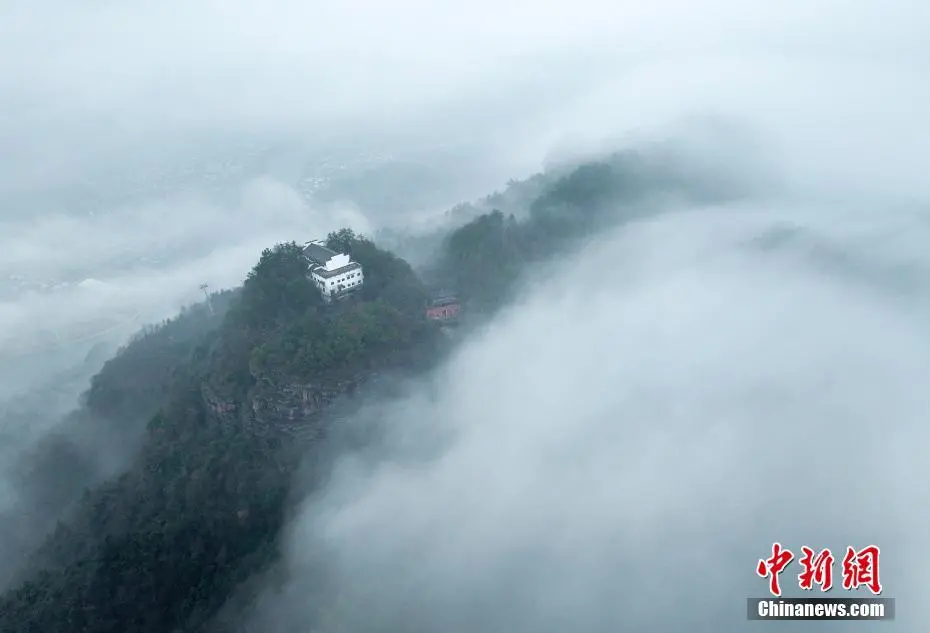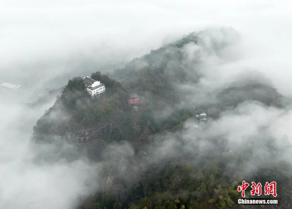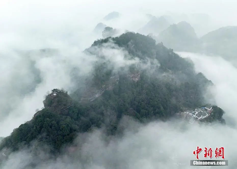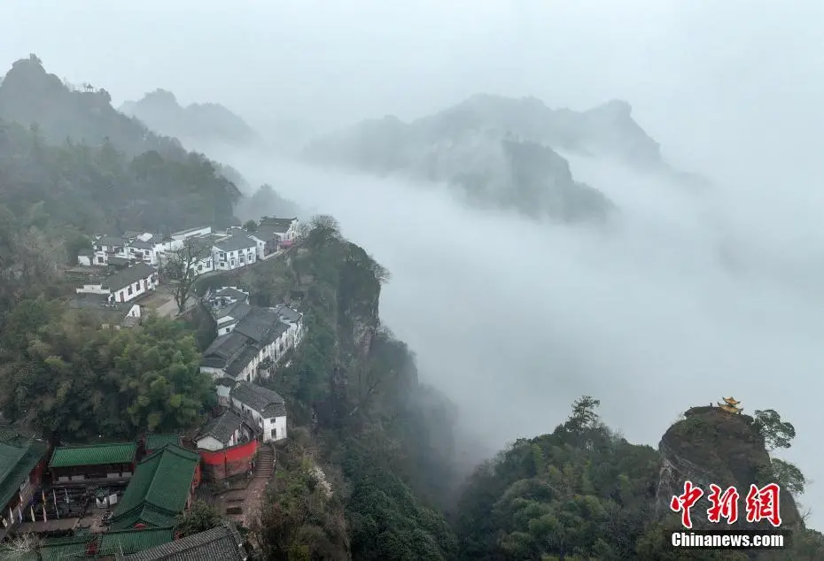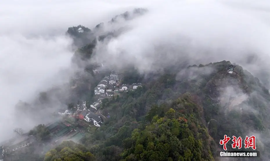 2月26日,春雨乍歇的安徽省黄山市休宁县齐云山云海翻滚,徽派民居若隐若现,宛若一幅泼墨山水画。(无人机照片)施亚磊 摄