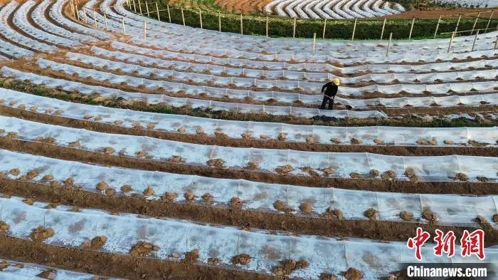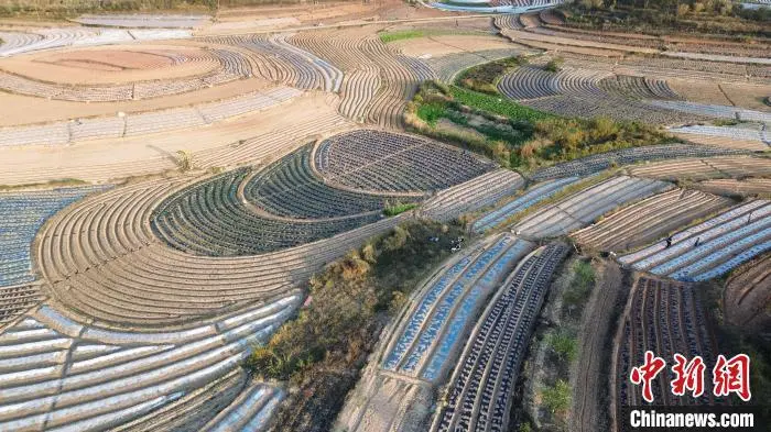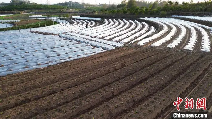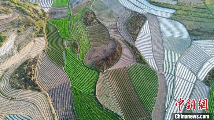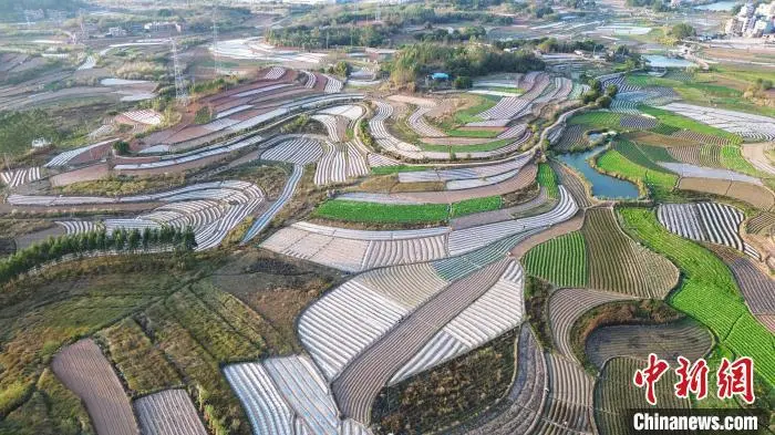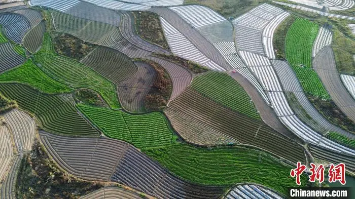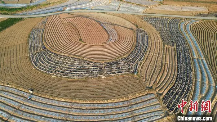 近日,在广西南宁市邕宁区蒲庙镇良信村,田园里白色和黑色的薄膜、形状各异的地块以及辛勤劳作的农民,构成一幅美丽的早春田园画卷。图为航拍当地田园美景。黄升模 摄