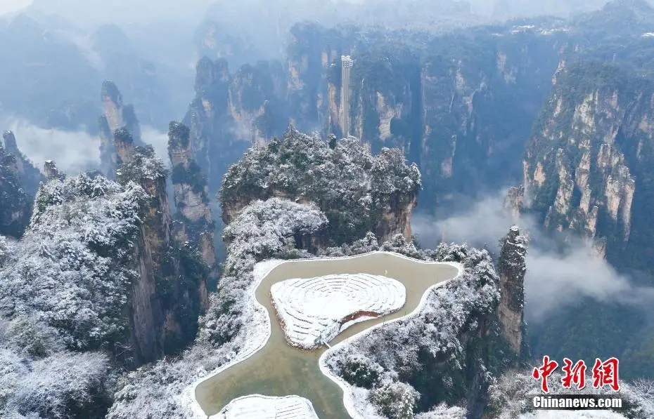 3月6日,湖南张家界国家森林公园雪后初霁,天子山、袁家界、黄石寨等景区同现云海雾凇日出美景,将张家界地貌风光装扮得更为迷人,让中外游客惊喜不已。图为银装素裹的空中田园。张洪涛 摄