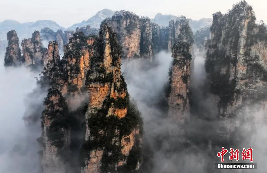 3月6日,湖南张家界国家森林公园雪后初霁,天子山、袁家界、黄石寨等景区同现云海雾凇日出美景,将张家界地貌风光装扮得更为迷人,让中外游客惊喜不已。图为云雾缭绕的张家界奇峰。邓道理 摄
