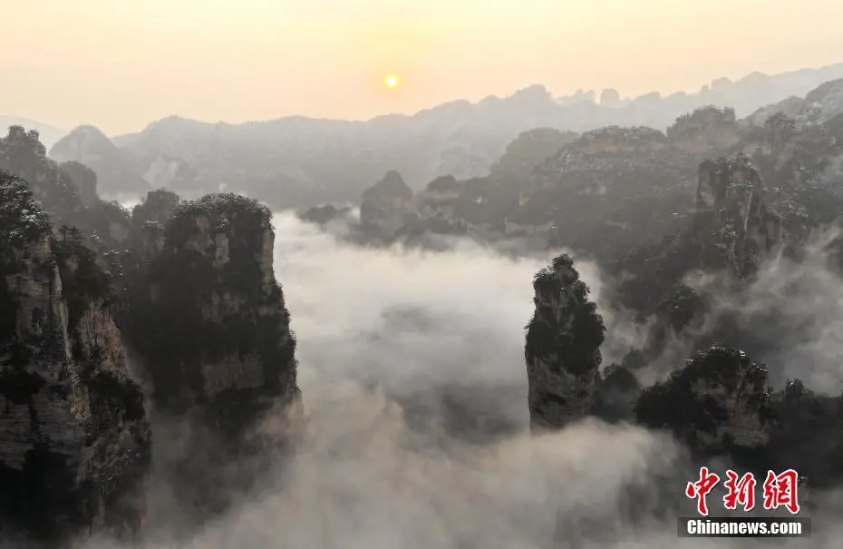 3月6日,湖南张家界国家森林公园雪后初霁,天子山、袁家界、黄石寨等景区同现云海雾凇日出美景,将张家界地貌风光装扮得更为迷人,让中外游客惊喜不已。张洪涛 摄