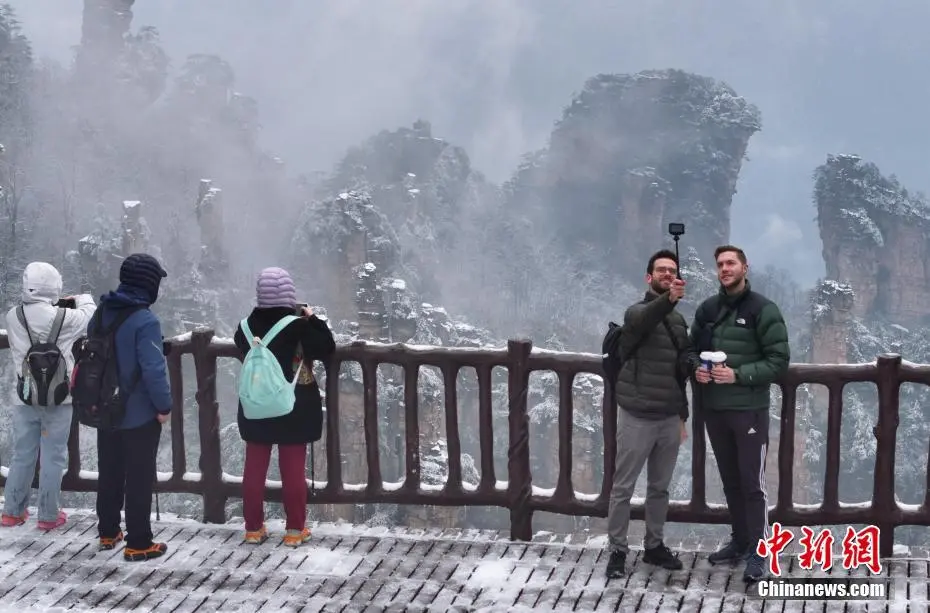 3月6日,湖南张家界国家森林公园雪后初霁,天子山、袁家界、黄石寨等景区同现云海雾凇日出美景,将张家界地貌风光装扮得更为迷人,让中外游客惊喜不已。图为外国游客与张家界美景合影。吴勇兵 摄