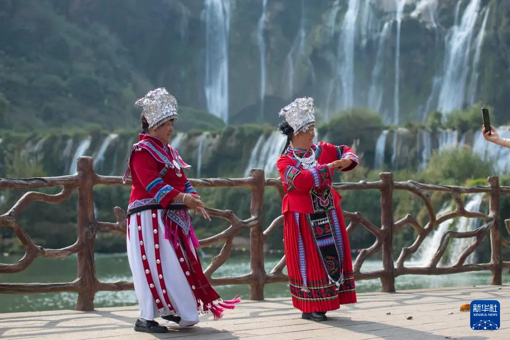3月10日,游人在云南省曲靖市罗平九龙瀑布群风景区拍照。