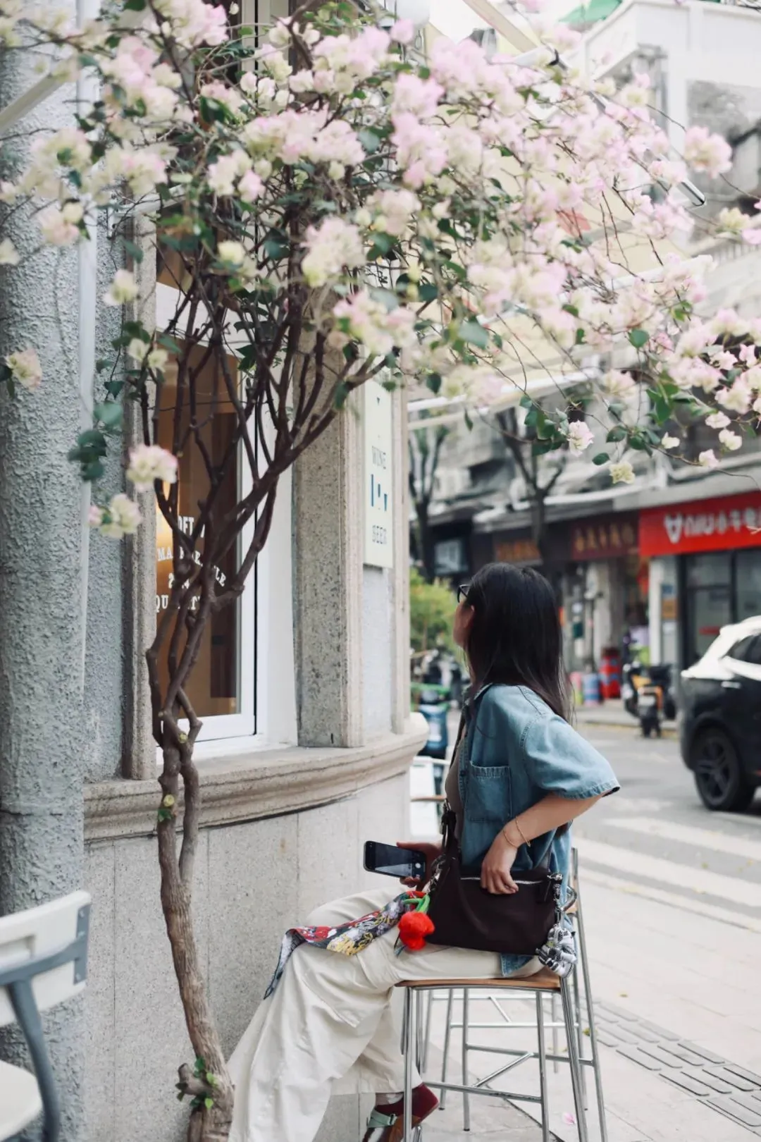 新开的源来咖啡民宿,在店门口放了一株粉白的三角梅。