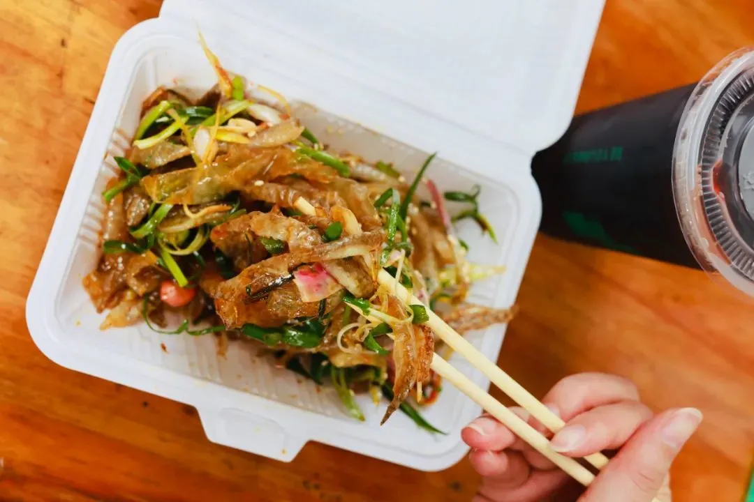 香葱、鱼皮、花生米和料汁,翻滚几下,鱼皮瞬间不单调了。