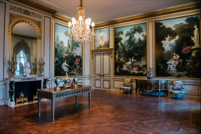 在相邻的房间,即大宅的绘图室里,呈现了法国艺术家让-奥诺雷·弗拉戈纳尔(Jean-Honoré Fragonard)创作的一套名为“爱的进程 ”的14幅油画。这组作品最初是路易十五的情人杜巴利夫人委托创作的四幅画作。但不知何故,杜巴利夫人拒绝了这组作品。弗拉戈纳尔一直保留着这些画作,20年后,他以一种自我委托的方式又创作了10幅主题画作。