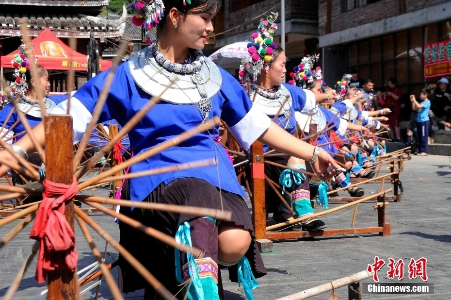 纺纱织布是侗寨妇女必备技能,侗布、侗锦图案丰富、灵秀雅致,2008年侗锦织造技艺列入国家非物质文化遗产保护名录。图为程阳八寨的侗族绣娘表演纺纱技艺接待各方来客。中新社记者 蒋雪林 摄