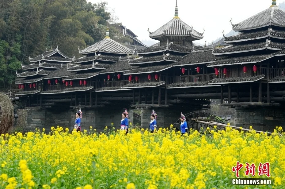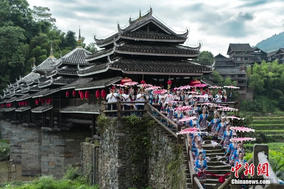 程阳八寨不仅保留了原生态自然古村落景观,在这里也能领略到最原始的侗族神秘风情。游客们来到程阳八寨可以观楼桥、赏歌舞、品侗宴,体验原滋原味的侗乡特色。中新社发 龚普康 摄