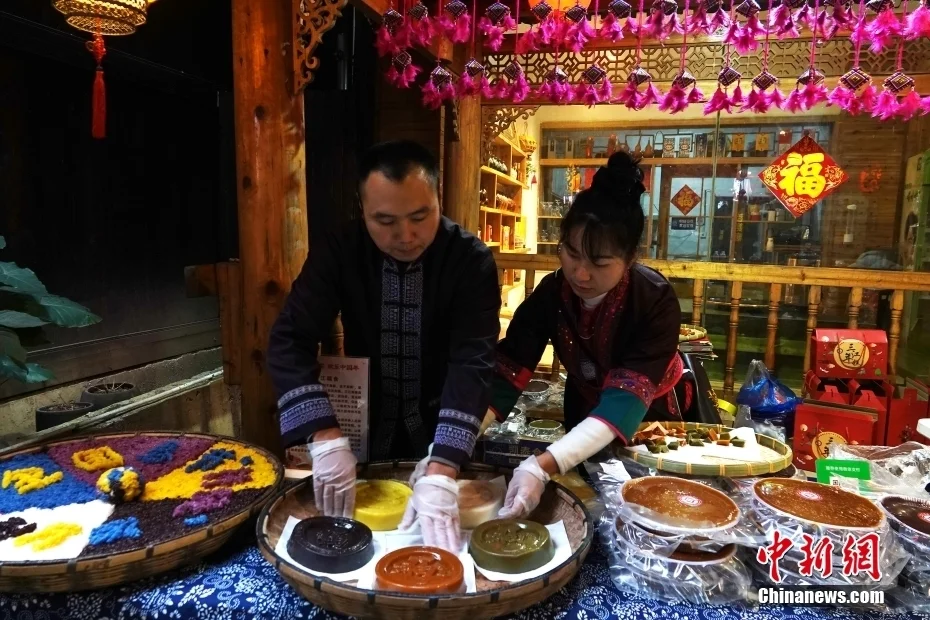 程阳八寨中的侗族村民在摆放制作好的年糕和五色糯米饭。