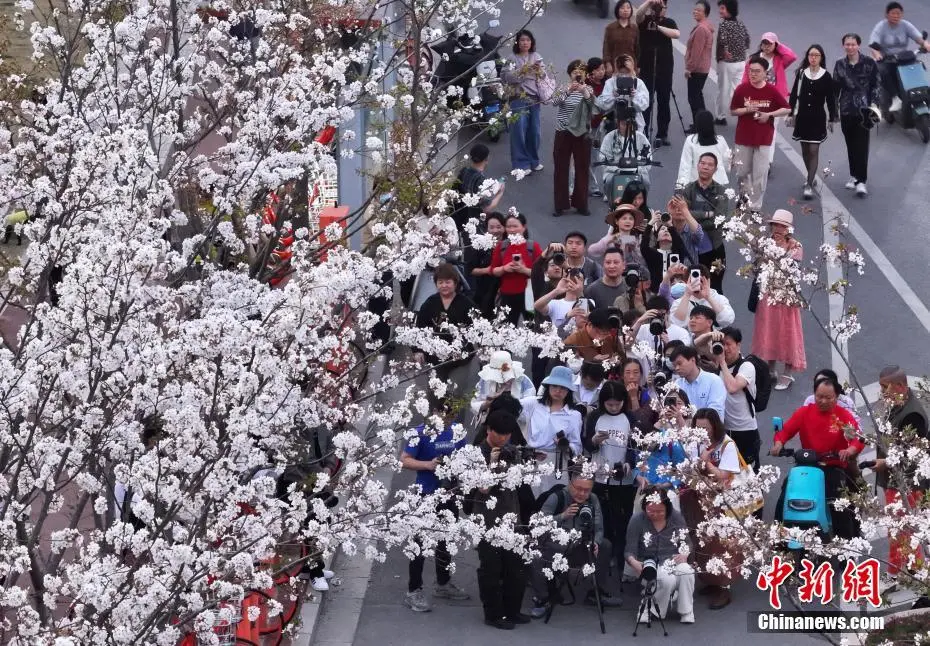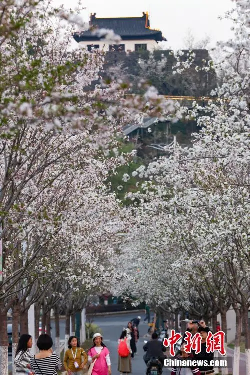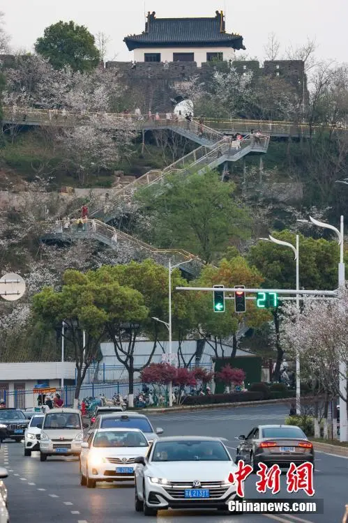 3月26日,江苏南京,游客在燕子矶观音门公园外的道路上欣赏樱花。这里的樱花在“之”字形楼梯两侧错落有致,市民和游客拾级而上共赏春色。中新社记者 泱波 摄