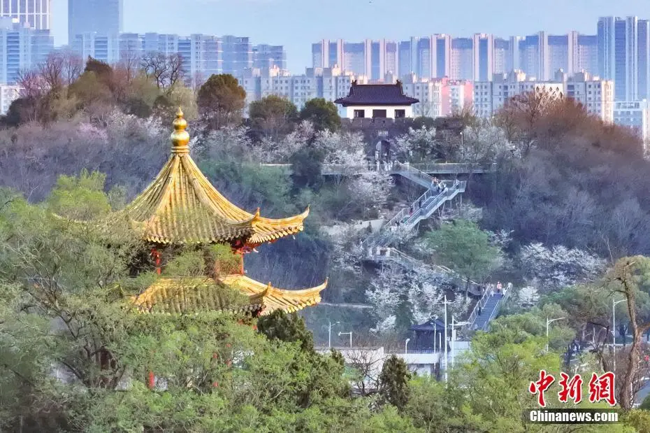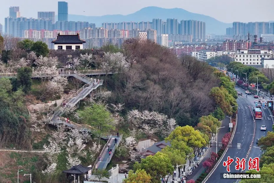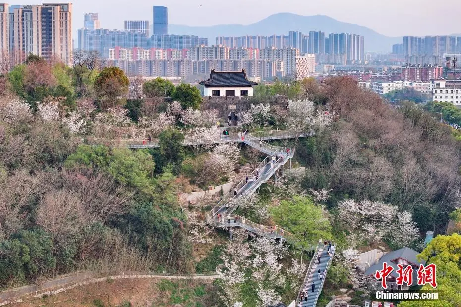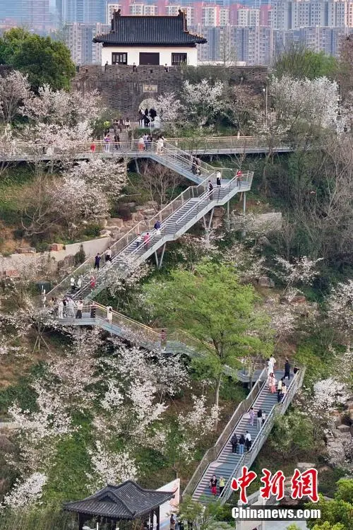 3月26日,江苏南京,燕子矶观音门公园里樱花在“之”字形楼梯两侧错落有致,市民和游客拾级而上共赏春色。近日,这里的樱花盛开,迎来最佳观赏期。中新社记者 泱波 摄