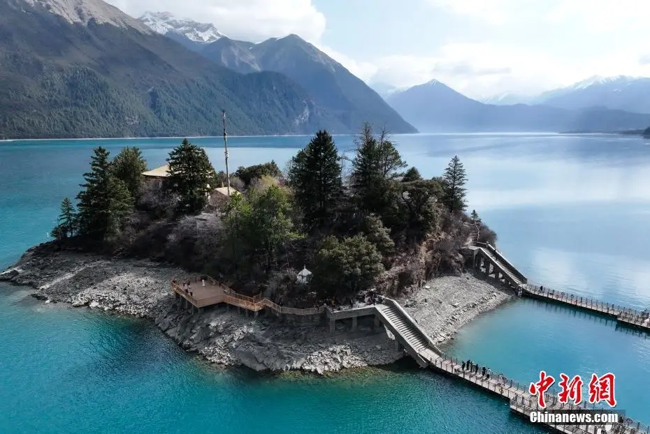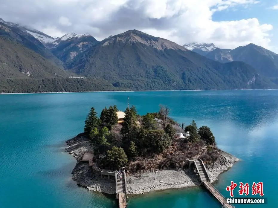 3月30日,航拍巴松措湖心岛。巴松措又名错高湖,位于西藏自治区林芝市工布江达县,是西藏首个自然风景类国家5A级旅游风景区。从空中俯瞰巴松措,碧蓝的湖水被雪山、森林环绕,宛如镶嵌在群山间的“蓝宝石”。(无人机照片)中新社记者 马铭言 摄