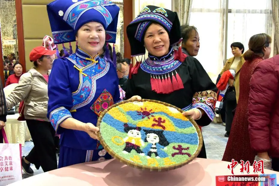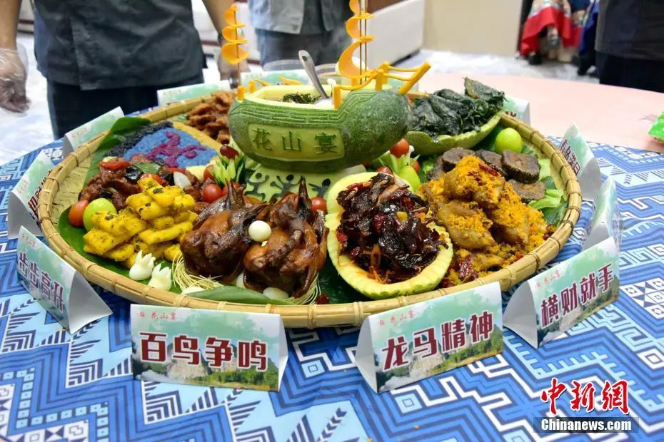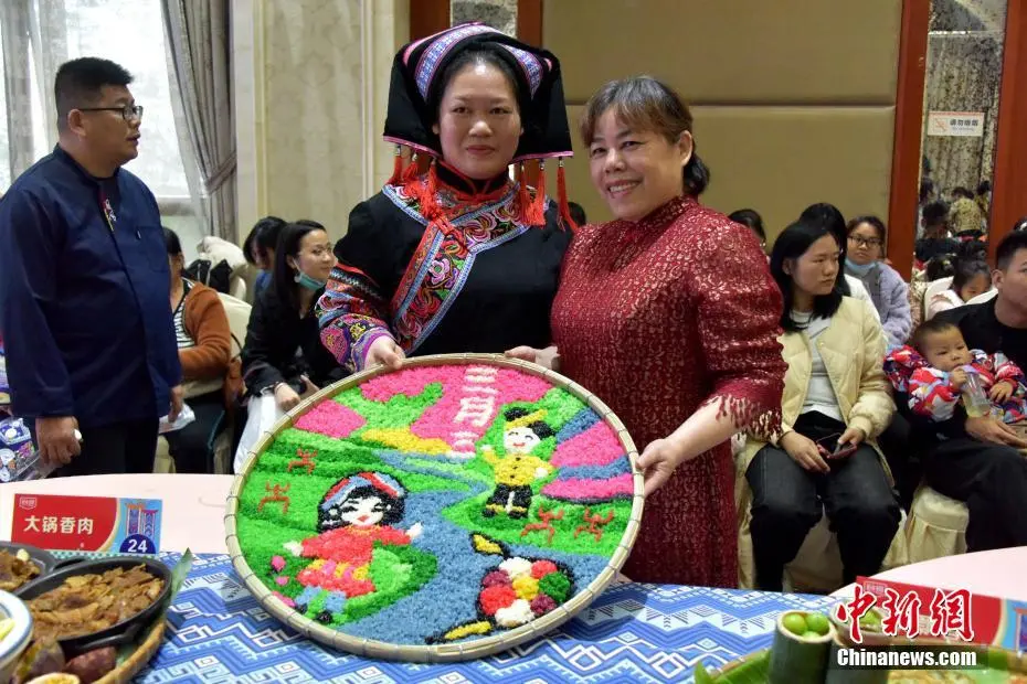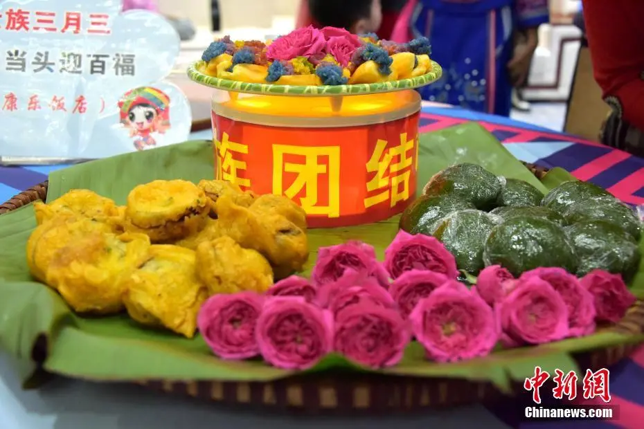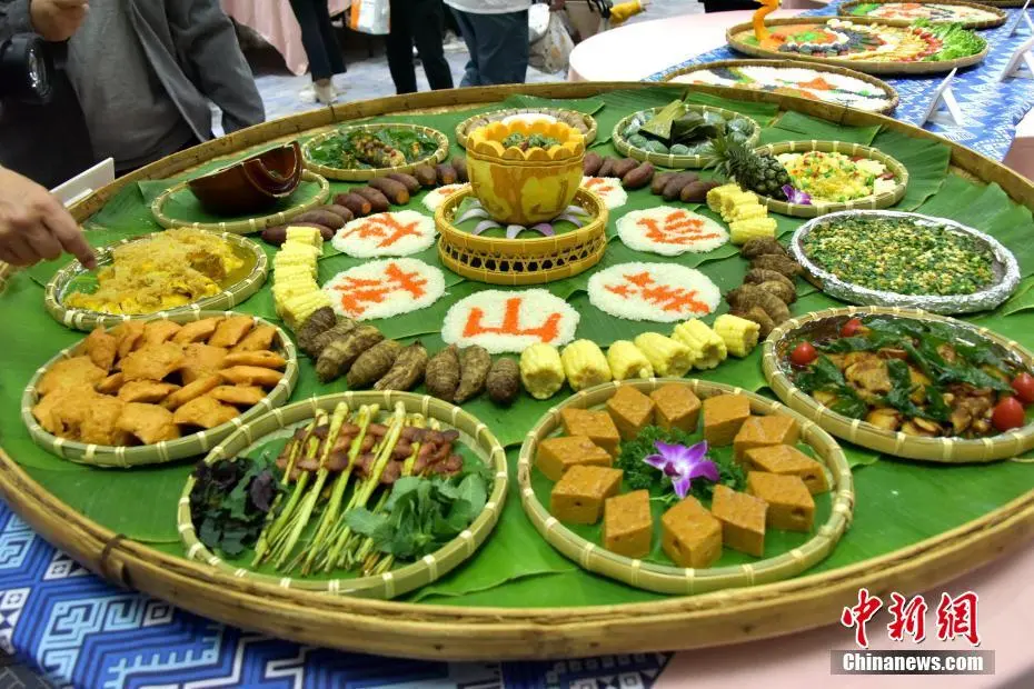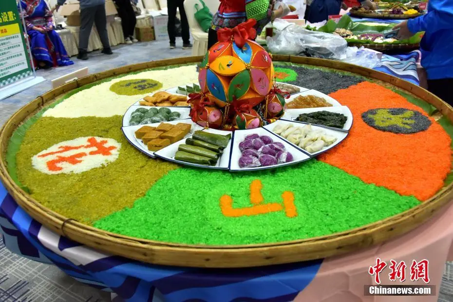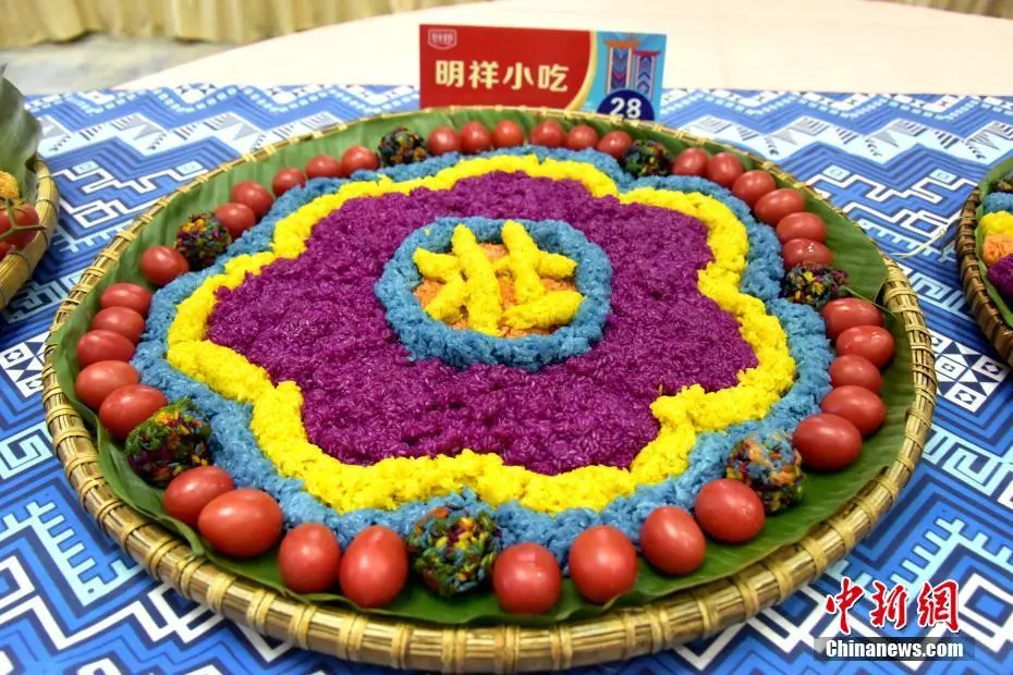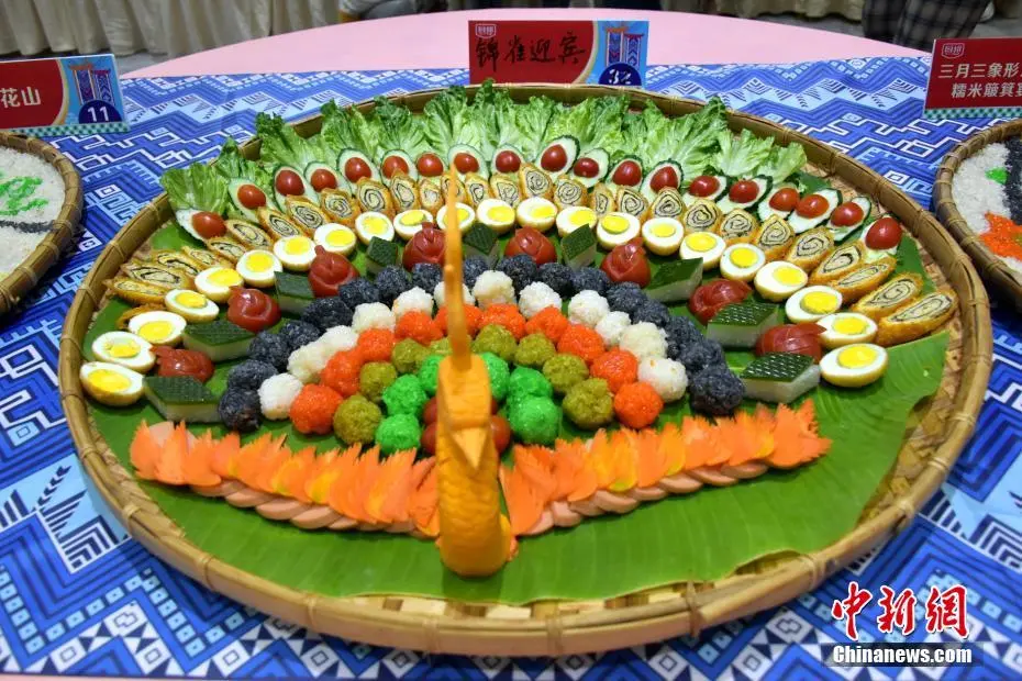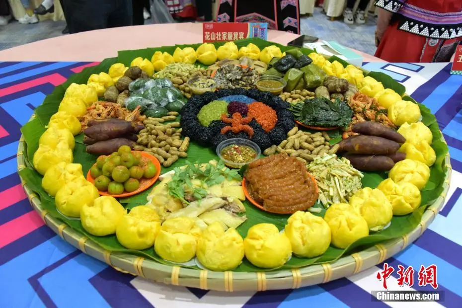 3月29日,广西崇左市宁明县举行“我们的节日·广西三月三”花山簸箕宴美食大赛。五彩糯米饭、烤土鸭、壮乡春卷……参赛选手精心创作簸箕美食作品,将观众带入美食与艺术交融的奇妙世界。图为簸箕宴美食展示。陈桂梅 摄