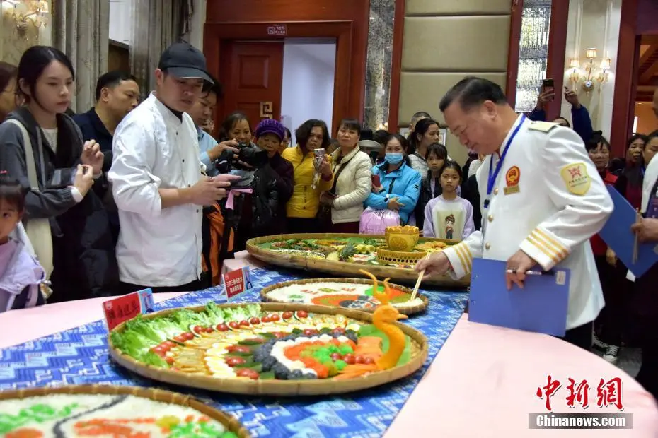 3月29日,广西崇左市宁明县举行“我们的节日·广西三月三”花山簸箕宴美食大赛。五彩糯米饭、烤土鸭、壮乡春卷……参赛选手精心创作簸箕美食作品,将观众带入美食与艺术交融的奇妙世界。图为评委在评审作品。陈桂梅 摄