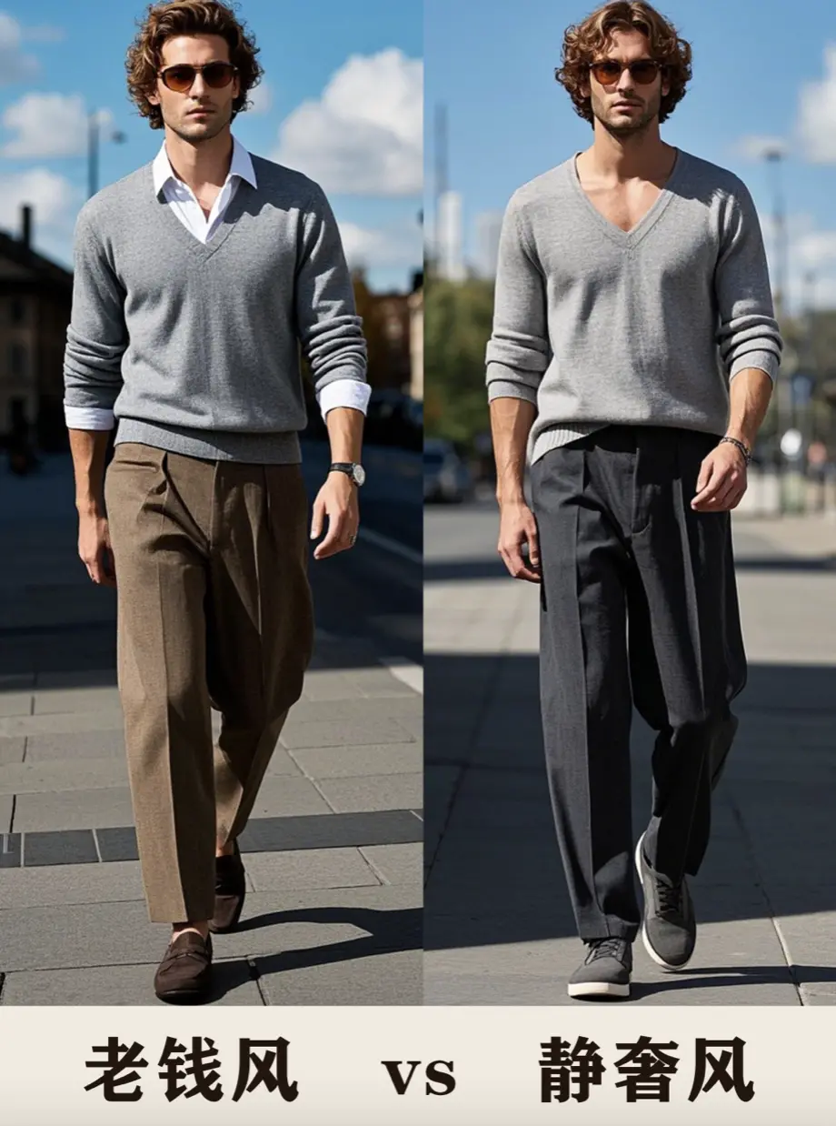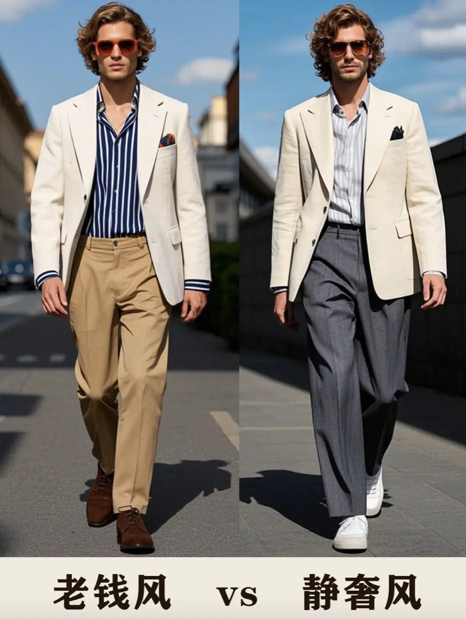 相较于老钱风强调传承和经典的理念不同,静奢风更注重现代感和创新。材质相较于老钱风,更注新兴材质或者对传统面料进行创新。色彩运用上也相对更柔和、淡雅。搭配方式上,静奢风更具灵活性和个性化,能将不同风格的单品巧妙融合,可以说是老钱风的进化版。