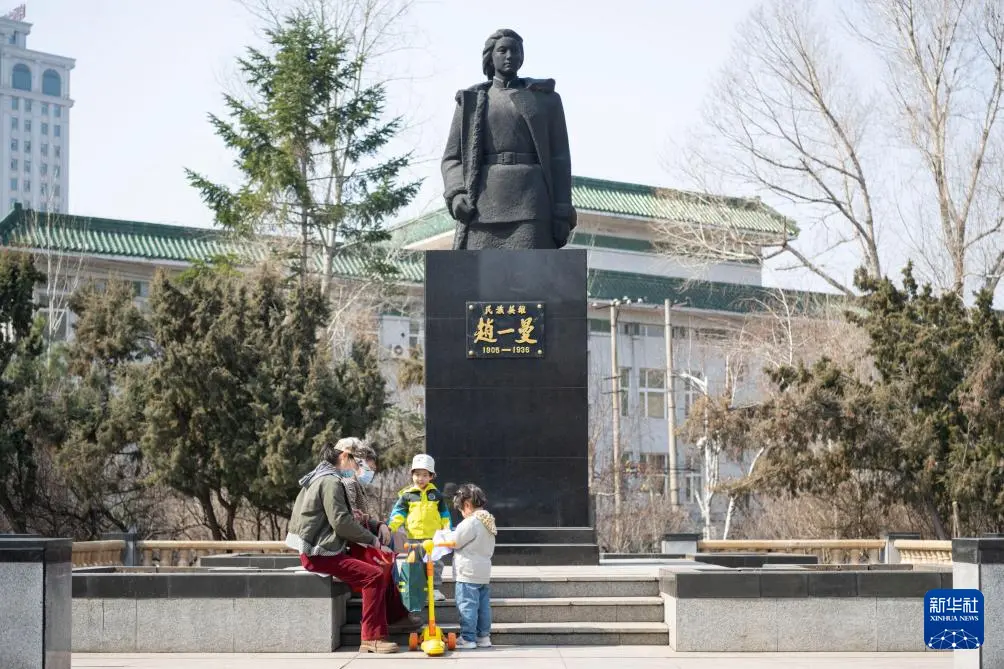 4月8日,在位于哈尔滨市南岗区一曼街上的一曼公园内,家长带着孩子在赵一曼塑像旁享受休闲时光。