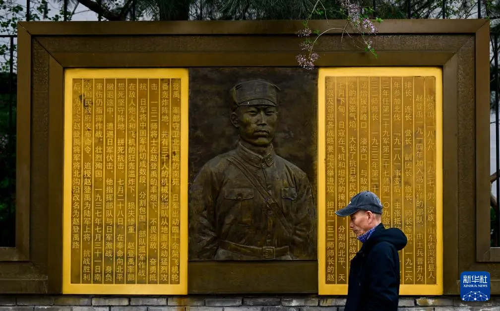 拼版照片:左图为赵登禹像(资料照片);右图为北京市西城区赵登禹路(新华社记者刘金海2025年3月26日摄)。