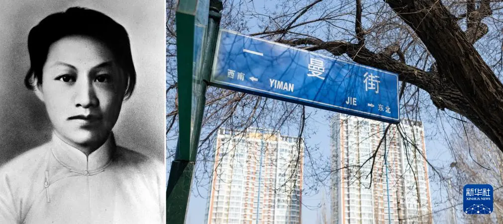 拼版照片:右图为哈尔滨市南岗区一曼街(新华社记者谢剑飞2025年4月8日摄);左图为赵一曼像(资料照片)。