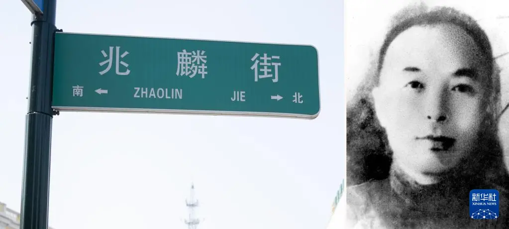 拼版照片:左图为哈尔滨市道里区兆麟街(新华社记者谢剑飞2025年4月8日摄);右图为李兆麟像(资料照片)。