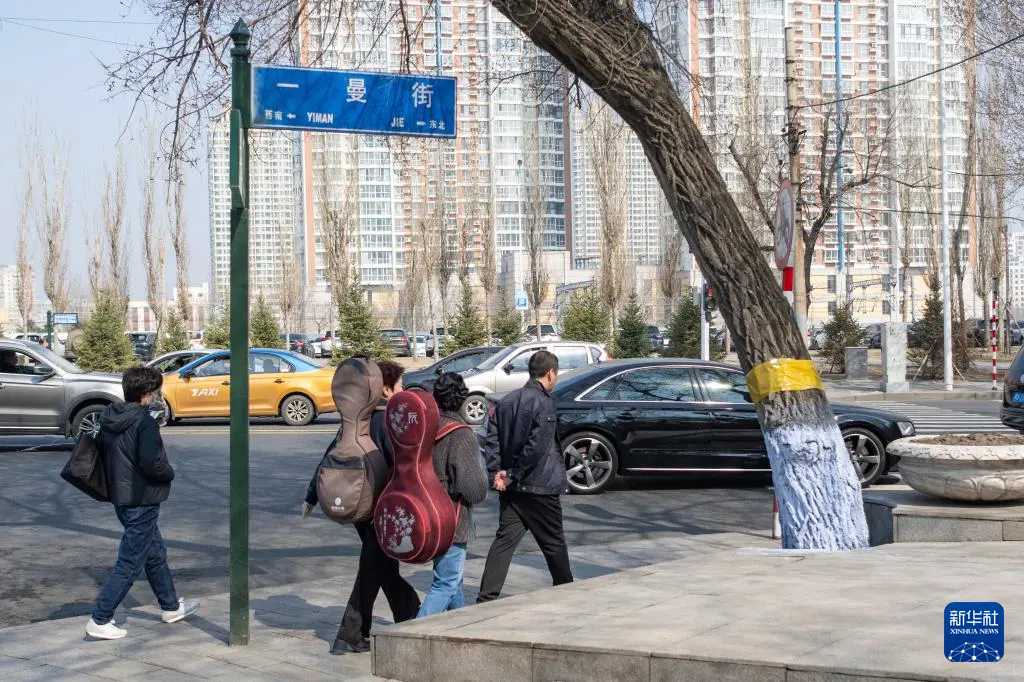 4月8日,人们走在位于哈尔滨市南岗区的一曼街上。