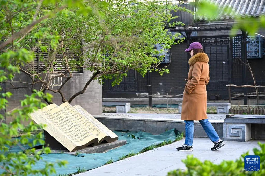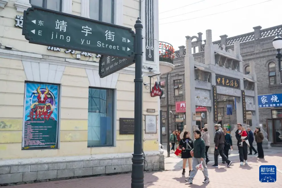 4月8日,在哈尔滨市道外区,人们在靖宇街旁的中华巴洛克历史文化街区游玩。