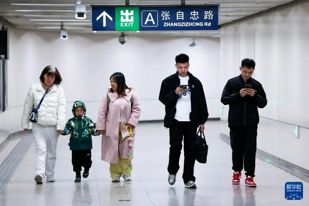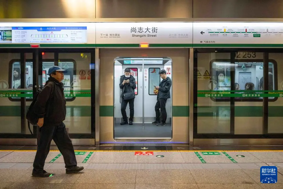 4月8日,在哈尔滨市道里区,人们在尚志大街地铁站内乘车。