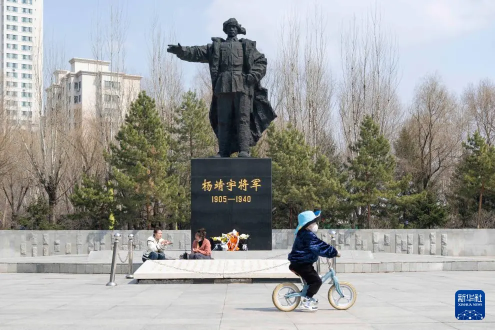 4月8日,在哈尔滨市道外区靖宇街东端的靖宇公园,家长带着孩子在杨靖宇塑像附近享受休闲时光。
