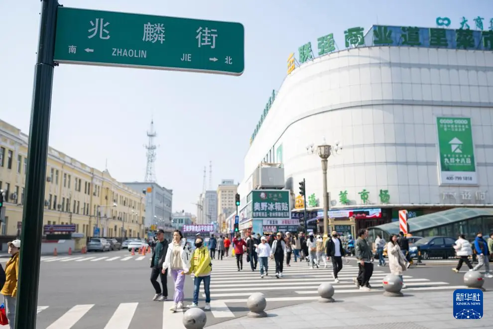 4月8日,在哈尔滨市道里区,人们行走在兆麟街上。
