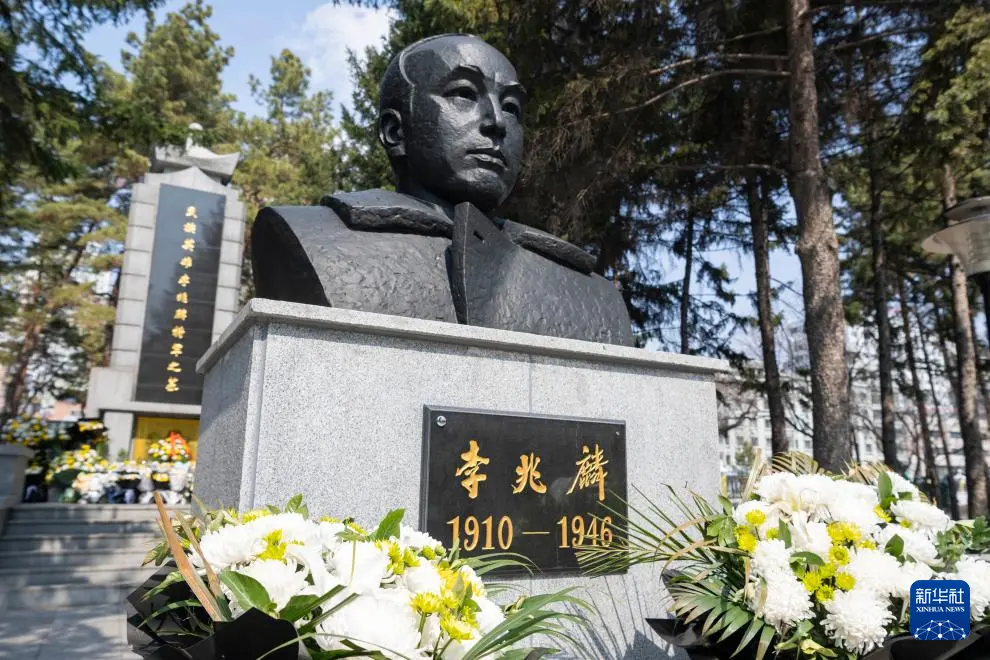 4月8日,在哈尔滨市道里区兆麟街北端的兆麟公园,李兆麟将军墓前摆满了鲜花。