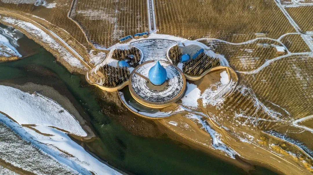 一滴水,两层楼高,大片的树林簇拥着它,绿色中的一抹蓝,描绘着中卫与黄河之间的深深羁绊。