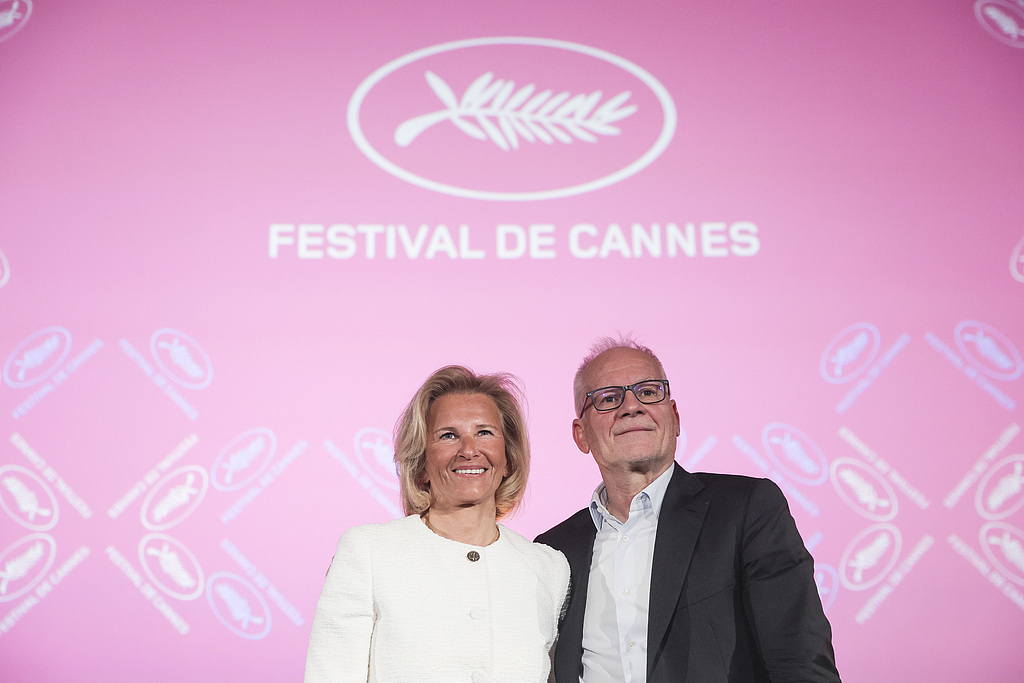 当地时间2025年4月10日,法国戛纳电影节主席艾瑞丝·诺布洛赫和总代表蒂耶里·福茂出席发布会。图片来源:视觉中国