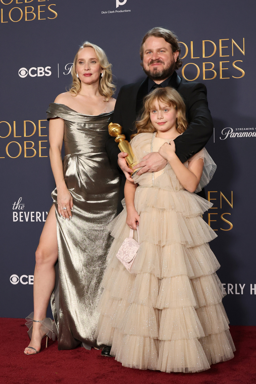 布拉迪·科贝特(右)和妻子兼创作搭档莫娜·法斯特欧德(左)及两人的女儿出席今年金球奖颁奖典礼。视觉中国 图