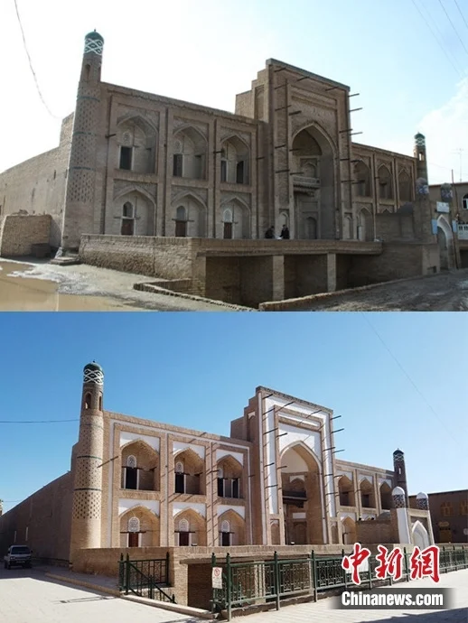修复项目由中国文化遗产研究院承担,主要包含希瓦古城内的阿米尔·图拉经学院和哈桑·穆拉德库什别吉清真寺的保护修复及其周边相关环境综合整治。图为修复前后的哈桑·穆拉德库什别吉清真寺。许言 供图